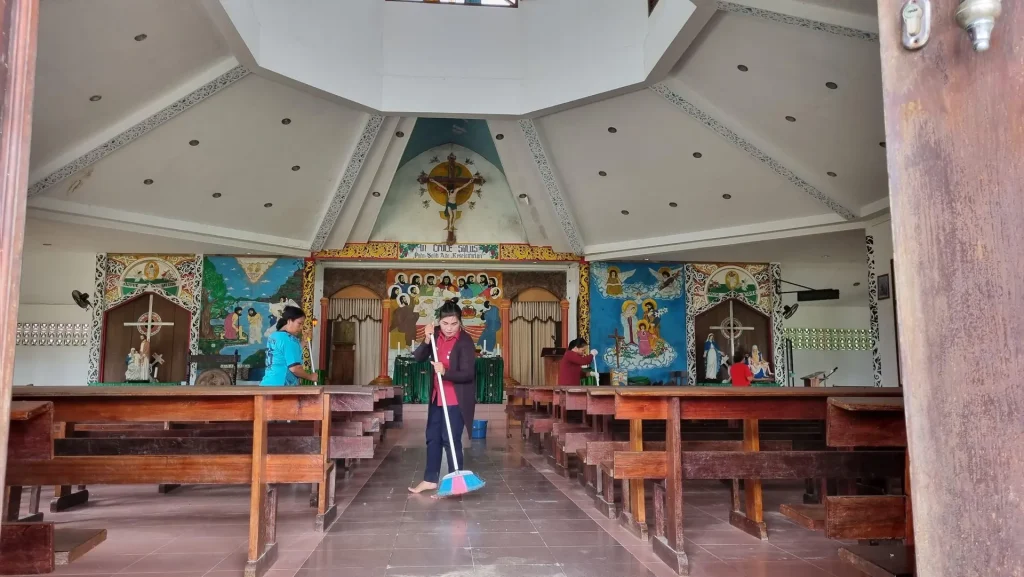 “Hari ini kami bersama dengan para pegawai dan staf membersihkan rumah ibadah yakni Gereja Santo Fransiskus Asisi Entikong yang merupakan Gereja Paroki umat Katolik di Kecamatan Entikong,” ucap Teguh.